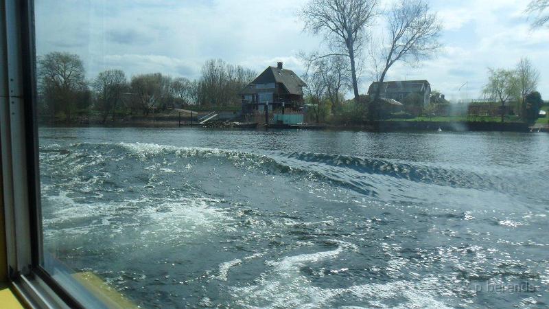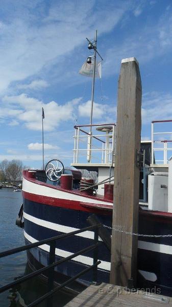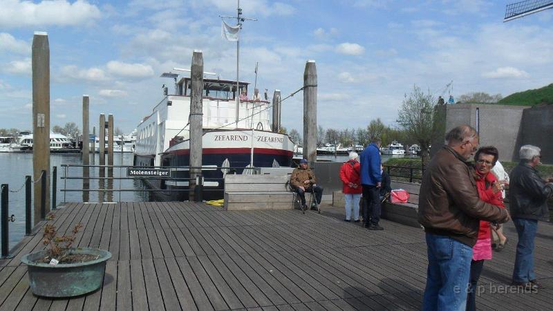 In Rossum werd bistro In Petto met een bezoek vereerd, Bourgondisch genieten stond er op het schoolbord. Er kon zowaar buiten gezeten worden, alleen even verstoord door de blauwe twee-takt dampen afkomstig van passerende oude nozems op prachtige Kreidlers en Zundapps! De rit werd vervolgd en tegen 13.00 h stond het hele wagenpark veilig (achter de hekken) geparkeerd van de scheepswerf te Heusden, keurig geregeld! Korte wandeling langs de stadswal met molens naar de aanlegsteiger van Wiljo. Daar gingen we aan boord van de Zeearend (uit 1954) om een mooie rondvaart te maken over Maas met uitleg over het geen we zagen. Koffie, thee, melk en lekkere broodjes werden ruimschoots geserveerd. Aan dek uit de wind en in het zonnetje was het heerlijk toeven! Genoeg te zien, veel pleziervaart en oude schepen op het water, mooie huizen langs de wal. Het eerste vee stond ook al in de wei of was aan het pootje baden!